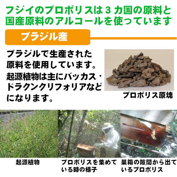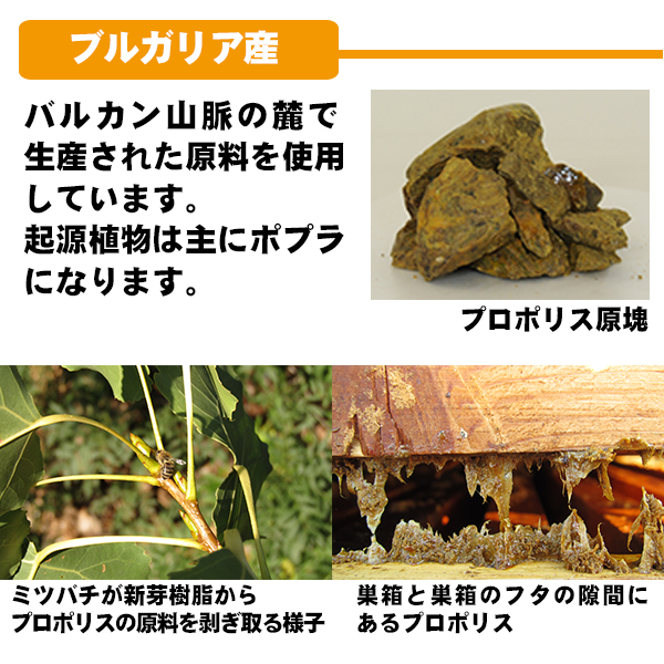 ブルガリア、オーストラリア、ブラジルの世界各地で生産される3タイプのプロポリスを使用しました。プロポリスはその地域の植物環境によって違う特徴を備えています。それぞれ特徴あるプロポリスをはちみつで飲みやすく仕上げました。